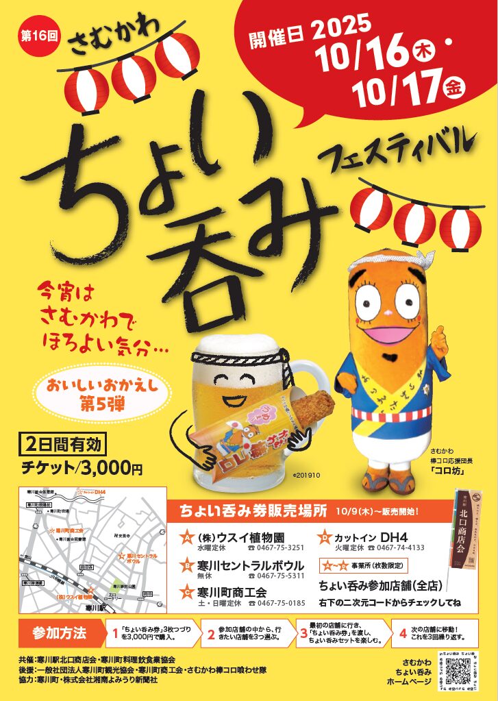 寒川の秋の人気イベント『第16回さむかわちょい呑みフェスティバル』の「ちょい呑み券」販売開始のご案内です。